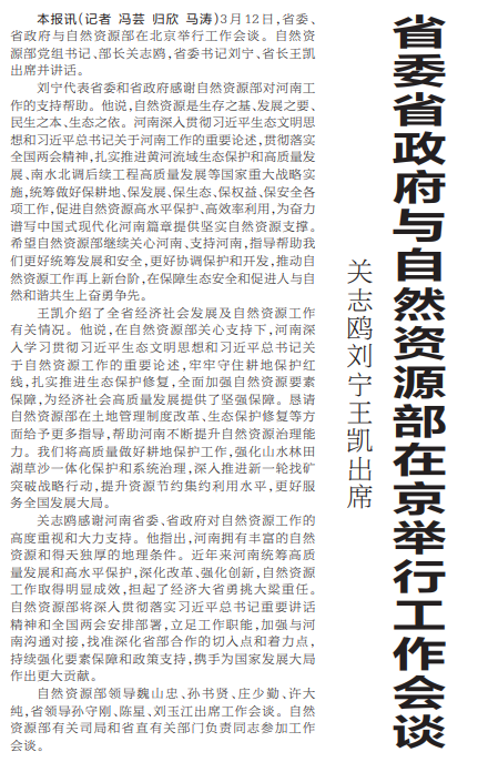 3月12日,省委、省政府与自然资源部在北京举行工作会谈。自然资源部党组书记、部长关志鸥,省委书记刘宁、省长王凯出席并讲话。(今日《河南日报》1版)