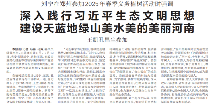 刘宁在郑州参加2025年春季义务植树活动时强调