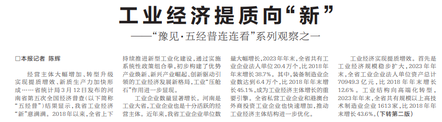 经营主体大幅增加、转型升级实现提质增效、新质生产力加快形成……省统计局3月12日发布的河南省第五次全国经济普查(以下简称“五经普”)结果显示,我省工业经济“新”意满满。2018年以来,全省上下持续推进新型工业化建设,通过实施系统性政策组合拳,初步构建了优势产业焕新、新兴产业崛起、创新驱动引领的工业经济发展新格局,工业“压舱石”作用进一步显现。(今日《河南日报》1版、2版)