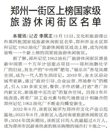 3月13日,文化和旅游部公布第四批国家级旅游休闲街区名单,郑州市金水区郑州记忆1952油化厂旅游休闲街区成功上榜,成为河南省唯一一个新上榜的国家级旅游休闲街区。(今日《郑州日报》2版)