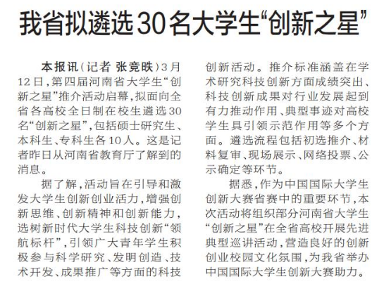 3月12日,第四届河南省大学生“创新之星”推介活动启幕,拟面向全省各高校全日制在校生遴选30名“创新之星”,包括硕士研究生、本科生、专科生各10人。这是记者昨日从河南省教育厅了解到的消息。(今日《郑州日报》2版)