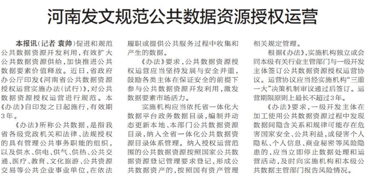 促进和规范公共数据资源开发利用,有效扩大公共数据资源供给,加快推进公共数据要素价值释放。近日,省政府办公厅印发《河南省公共数据资源授权运营实施办法(试行)》,对公共数据资源授权运营进行规范。本《办法》自印发之日起施行,有效期3年。(今日《郑州日报》2版)