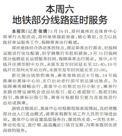 3月15日,郑州奥林匹克体育中心将举行大型活动,郑州地铁提前准备,精心筹划,全力以赴做好客运服务工作,保障乘客出行畅通。(今日《郑州日报》5版)