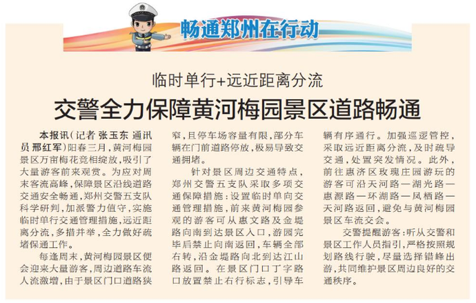 阳春三月,黄河梅园景区万亩梅花竞相绽放,吸引了大量游客前来观赏。为应对周末客流高峰,保障景区沿线道路交通安全畅通,郑州交警五支队科学研判,加派警力值守,实施临时单行交通管理措施,远近距离分流,多措并举,全力做好疏堵保通工作。(今日《郑州日报》5版)