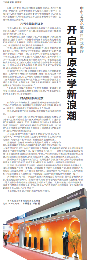 3月11日至13日中国国际服装服饰博览会(春季)开幕期间,中原时尚·艺秀中牟合作发布仪式在国家会展中心(上海)举行,随着河南中牟新区管委会与中国服装协会、艺尚未来产业发展(杭州)有限公司三方正式签署战略合作协议,艺秀小镇项目正式签约。(今日《河南日报》4版)