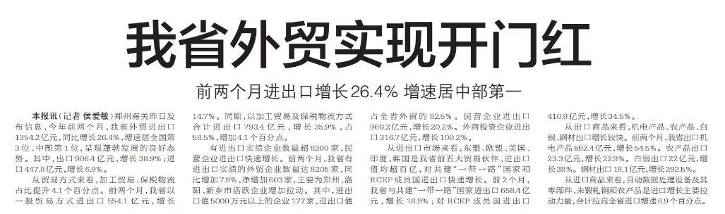 郑州海关昨日发布信息,今年前两个月,我省外贸进出口1354.2亿元,同比增长26.4%,增速居全国第3位、中部第1位,呈现蓬勃发展的良好态势。其中,出口906.4亿元,增长38.9%;进口447.8亿元,增长6.9%。(今日《郑州日报》6版)