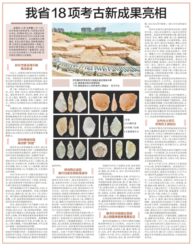 3月12日,由河南省文物局指导,河南省文物考古学会、《华夏杂志》主办,河南省文物考古研究院承办的2024河南考古新发现论坛在郑举行。汝州温泉旧石器遗址、灵宝北阳平遗址、荥阳楚湾遗址等18项考古发现新成果逐一亮相,为研究中原文明的历史脉络、文化特色和发展进程等提供了重要资料,呈现出2024年河南考古工作成果丰硕、学术研究活跃的生动面貌。(今日《郑州日报》8版)