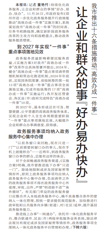 持续优化政务服务,让企业和群众的事情“好办、易办、快办”。11月26日,市政府发布《郑州市进一步优化政务服务提升行政效能推动“高效办成一件事”实施方案》,系统谋划我市“高效办成一件事”的时间表、任务书和路线图,确定新阶段政务服务改革的主攻方向和战略重点,推动政务服务提质增效。(今日《郑州日报》1版、6版)