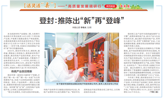 2024年,登封市在转方式、调结构、提质量、增效益上持续发力,聚焦新材料等产业链条,推动传统产业改旧育新、新兴产业培优塑新、未来产业超前谋新,不断提升产业体系现代化水平。1~9月份,该市规上工业增加值同比增长8.8%,固定资产投资同比增长11.6%,一般公共预算收入同比增长8.26%,增速在郑州六县(市)均名列前茅。(今日《郑州日报》1版、2版)