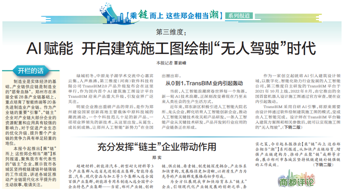 本报今起推出【乘“链”而上 这些郑企相当“潮”】系列报道,聚焦我市有代表性的“链主”企业,展示我市各城区坚持梳链建链补链强链的工作成效,讲述各城区推动产业链现代化水平提升的生动故事,敬请关注。