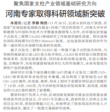 11月26日,记者从省科技厅获悉,在国家“区域创新发展联合基金(河南)”项目的资助下,河南大学申怀彬教授与中国科学技术大学樊逢佳教授等人合作,在环境友好型量子点发光二极管(QLED)领域研究工作取得突破性进展。相关成果在国际顶级期刊《自然》(Nature)发表。这也是我省高校首次作为第一通讯单位在该期刊发表研究成果。(今日《郑州日报》2版)