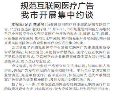 为促进我市医疗行业规范发布互联网广告,严厉打击违法违规行为,11月26日,市市场监管局网监分局组织召开全市医疗行业发布互联网广告行政约谈会,对抖音、快手、腾讯、河南整形美容医院、郑州长江中医院、郑州博爱眼耳鼻喉医院、郑州强直类风湿医院等平台企业和医疗企业进行集中约谈。(今日《郑州日报》2版)