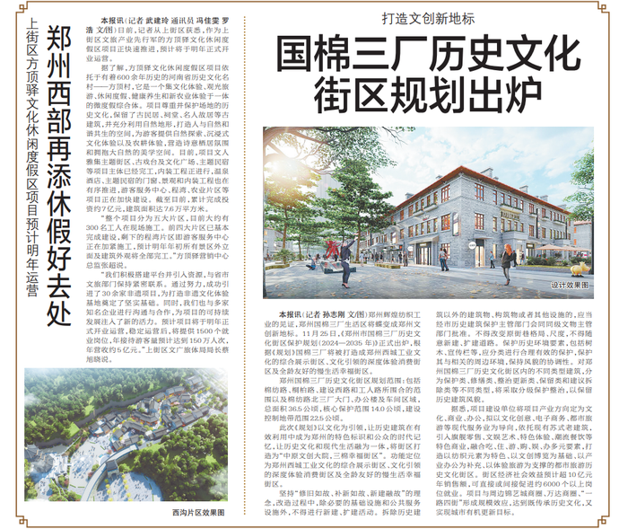 郑州辉煌纺织工业的见证,郑州国棉三厂生活区将蝶变成郑州文创新地标。11月25日,《郑州市国棉三厂历史文化街区保护规划(2024—2035 年)》正式出炉,根据《规划》国棉三厂将被打造成郑州西城工业文化的综合展示街区、文化引领的深度体验消费街区及全龄友好的慢生活幸福街区。(今日《郑州日报》7版)