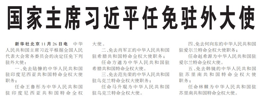 中华人民共和国主席习近平根据全国人民代表大会常务委员会的决定任免下列驻外大使: