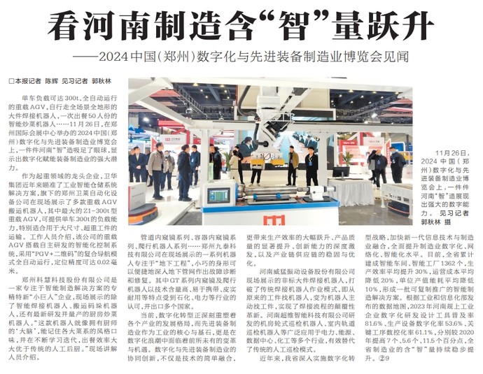 单车负载可达300t、全自动运行的重载AGV,自行走全场景全地形的大件焊接机器人,一次出餐50人份的智能炒菜机器人……11月26日,在郑州国际会展中心举办的2024中国(郑州)数字化与先进装备制造业博览会上,一件件河南“智”造吸足了眼球,显示出数字化赋能装备制造业的强大潜力。(今日《河南日报》2版)