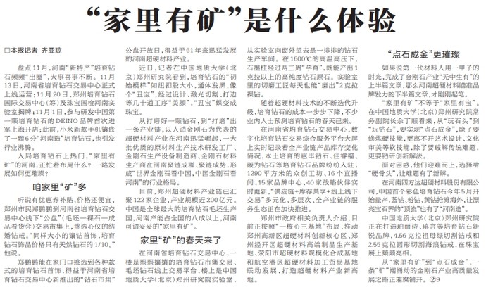 盘点11月,河南“新特产”培育钻石频频“出圈”,大事喜事不断。11月13日,河南省培育钻石交易中心正式上线运营;11月20日,郑州培育钻石国际交易中心(筹)及珠宝国检河南实验室揭牌;11月1日,参与研发中国第一颗培育钻石的DEINO品牌首次进军上海开店;此前,小米新款手机镶嵌了一颗6分“河南造”培育钻石,也引发行业沸腾。(今日《河南日报》2版)