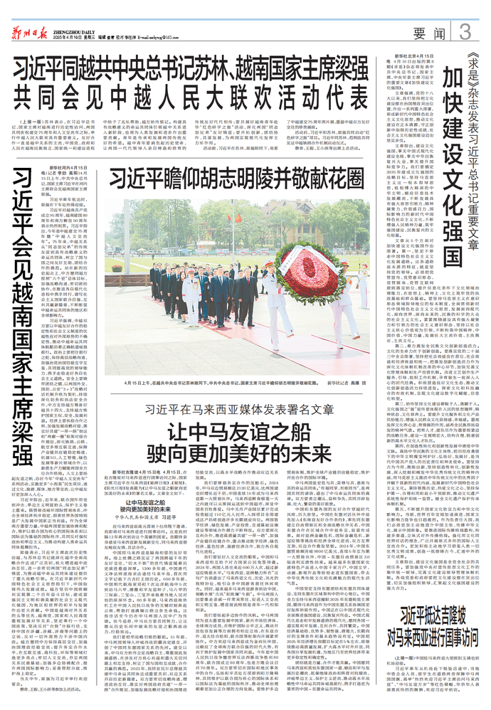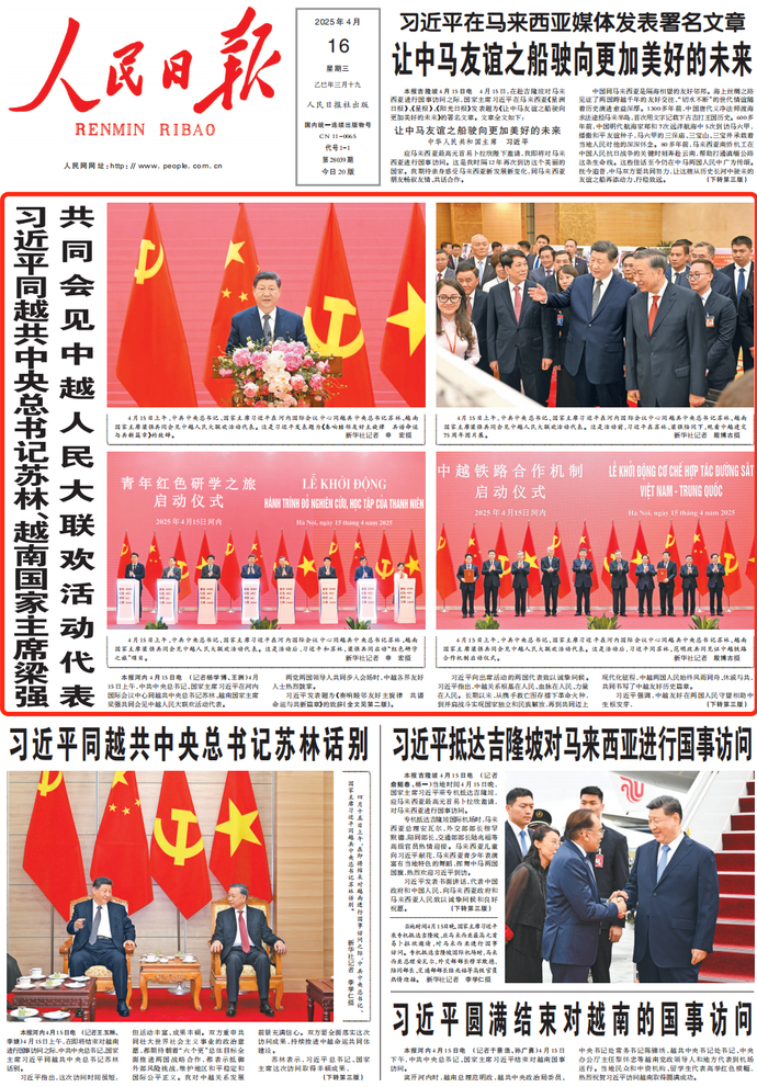 4月15日下午,中共中央总书记、国家主席习近平结束对越南国事访问。(今日《人民日报》1版)