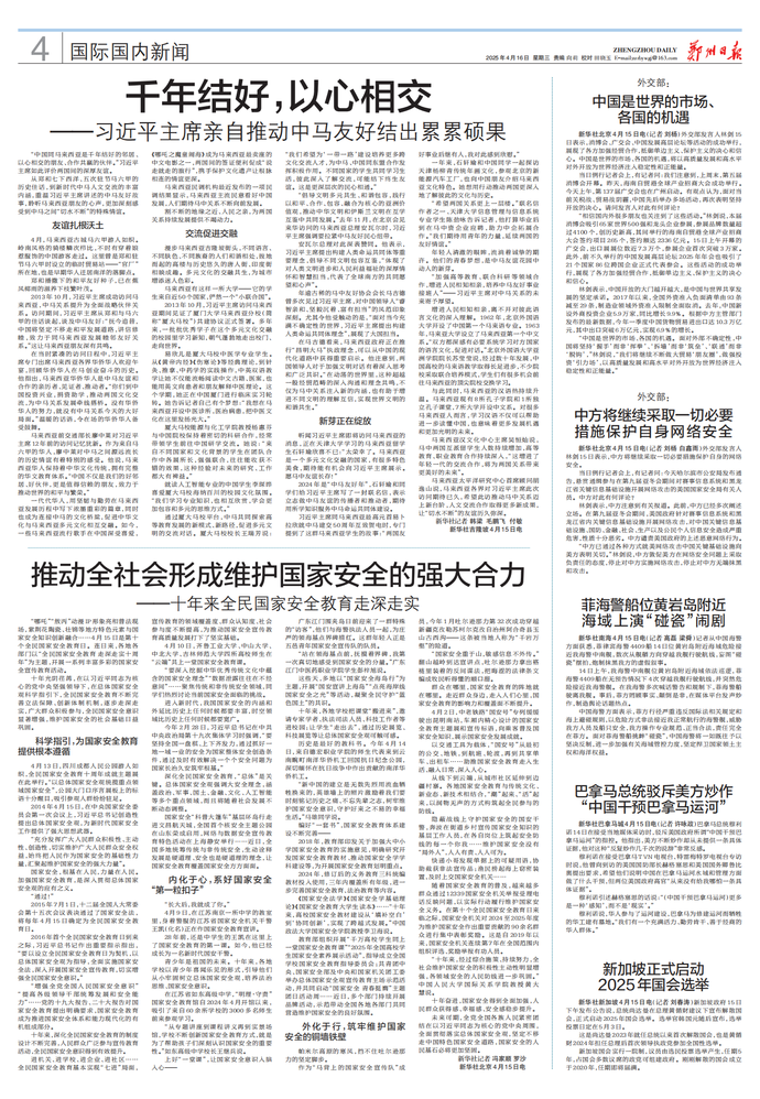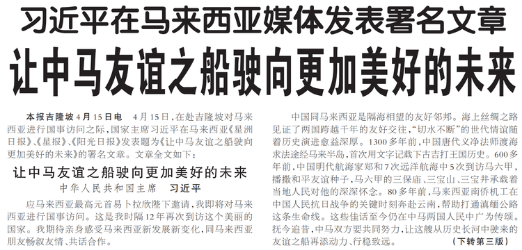 4月15日,在赴吉隆坡对马来西亚进行国事访问之际,国家主席习近平在马来西亚《星洲日报》、《星报》、《阳光日报》发表题为《让中马友谊之船驶向更加美好的未来》的署名文章。(今日《人民日报》1版、3版)