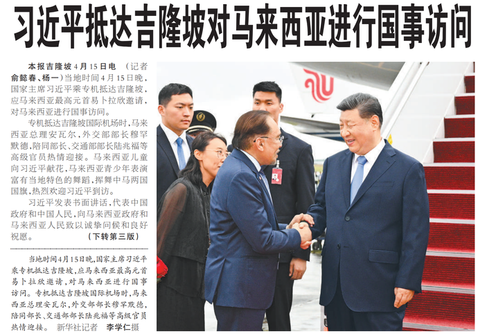当地时间4月15日晚,国家主席习近平乘专机抵达吉隆坡,应马来西亚最高元首易卜拉欣邀请,对马来西亚进行国事访问。(今日《人民日报》1版、3版)