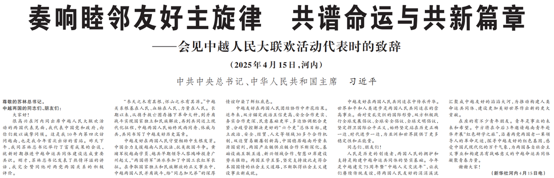 4月15日上午,中共中央总书记、国家主席习近平在河内国际会议中心同越共中央总书记苏林、越南国家主席梁强共同会见中越人民大联欢活动代表。(今日《人民日报》1版、3版)