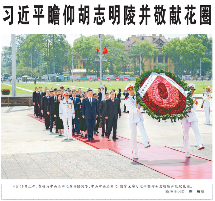 4月15日上午,在越共中央总书记苏林陪同下,中共中央总书记、国家主席习近平瞻仰胡志明陵并敬献花圈。(今日《人民日报》2版)