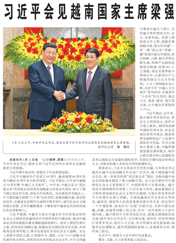 4月15日上午,中共中央总书记、国家主席习近平在河内主席府会见越南国家主席梁强。(今日《人民日报》2版)