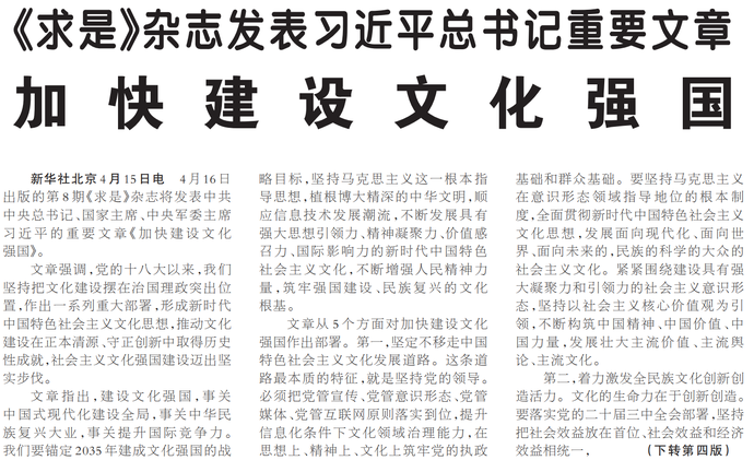 4月16日出版的第8期《求是》杂志将发表中共中央总书记、国家主席、中央军委主席习近平的重要文章《加快建设文化强国》。(今日《人民日报》2版、4版)
