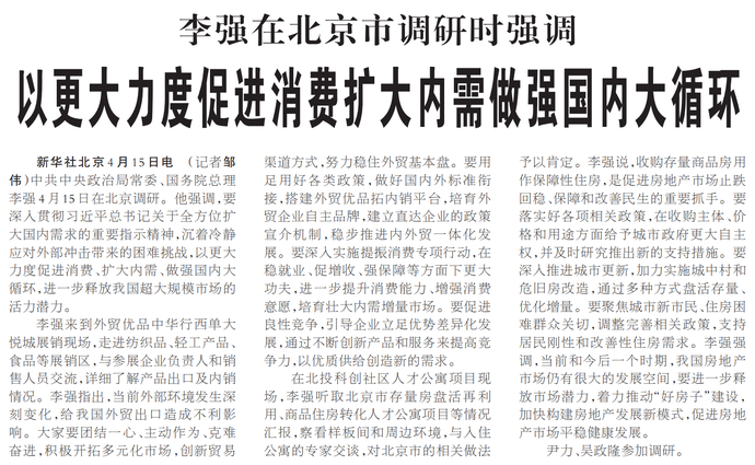 中共中央政治局常委、国务院总理李强4月15日在北京调研。他强调,要深入贯彻习近平总书记关于全方位扩大国内需求的重要指示精神,沉着冷静应对外部冲击带来的困难挑战,以更大力度促进消费、扩大内需、做强国内大循环,进一步释放我国超大规模市场的活力潜力。(今日《人民日报》4版)