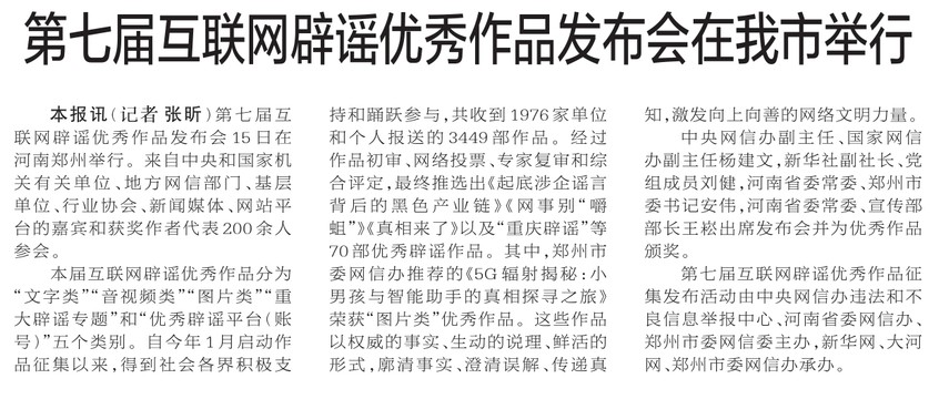 第七届互联网辟谣优秀作品发布会15日在河南郑州举行。来自中央和国家机关有关单位、地方网信部门、基层单位、行业协会、新闻媒体、网站平台的嘉宾和获奖作者代表200余人参会。