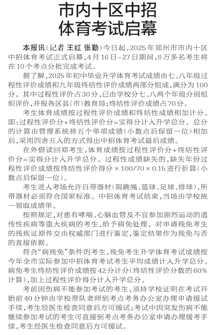 今日起,2025年郑州市市内十区中招体育考试正式启幕,4月16日~27日期间,8万多名考生将在10个考点分批完成考试。(今日《郑州日报》2版)