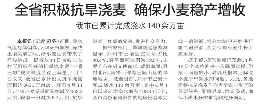 近期,我省气温持续偏高,大风天气频发,导致土壤失墒加快,给小麦生长带来了严峻挑战。记者从14日省农业农村厅组织召开的抗旱浇麦暨“一喷三防”视频调度会议上获悉,4月1日以来,全省已累计投入抗旱浇麦面积达3630万亩次。截至4月14日,全省小麦受旱面积缩减至958.2万亩,较前一日减少5.7万亩,抗旱浇麦工作成效显著,推进扎实有力。(今日《郑州日报》2版)