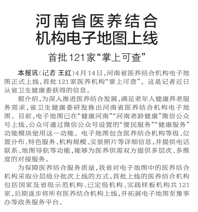 4月14日,河南省医养结合机构电子地图正式上线,首批121家医养机构“掌上可查”。这是记者近日从省卫生健康委获得的信息。(今日《郑州日报》2版)