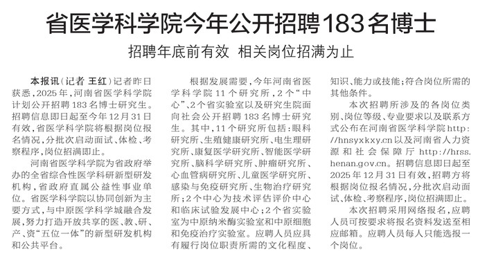 记者昨日获悉,2025年,河南省医学科学院计划公开招聘183名博士研究生。招聘信息即日起至今年12月31日有效,省医学科学院将根据岗位报名情况,分批次启动面试、体检、考察程序,岗位招满即止。(今日《郑州日报》2版)