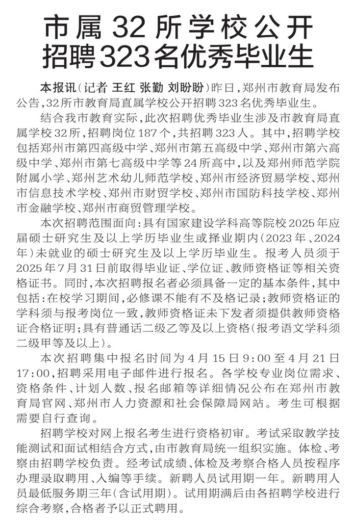 昨日,郑州市教育局发布公告,32所市教育局直属学校公开招聘323名优秀毕业生。(今日《郑州日报》2版)