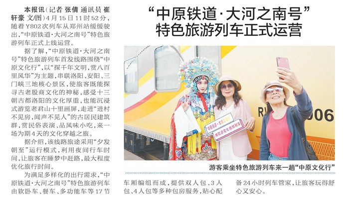 4月15日11时52分,随着Y802次列车从郑州站缓缓驶出,“中原铁道·大河之南号”特色旅游列车正式上线运营。(今日《郑州日报》2版)