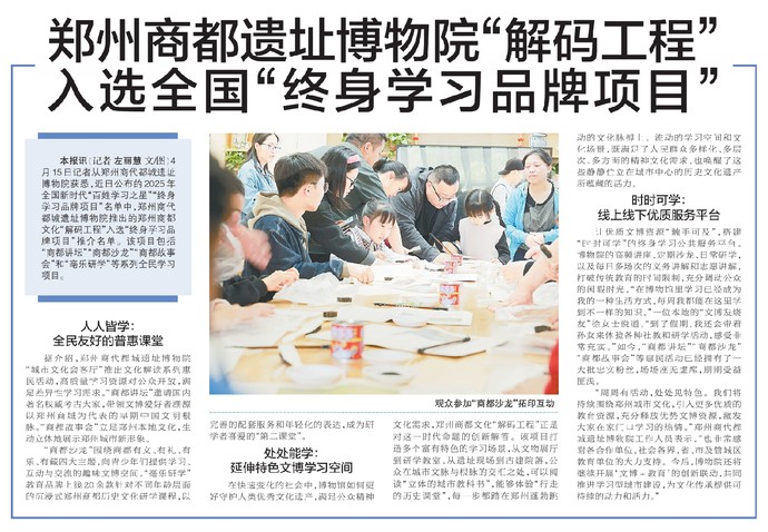 4月15日记者从郑州商代都城遗址博物院获悉,近日公布的2025年全国新时代“百姓学习之星”“终身学习品牌项目”名单中,郑州商代都城遗址博物院推出的郑州商都文化“解码工程”入选“终身学习品牌项目”推介名单。该项目包括“商都讲坛”“商都沙龙”“商都故事会”和“亳乐研学”等系列全民学习项目。(今日《郑州日报》8版)