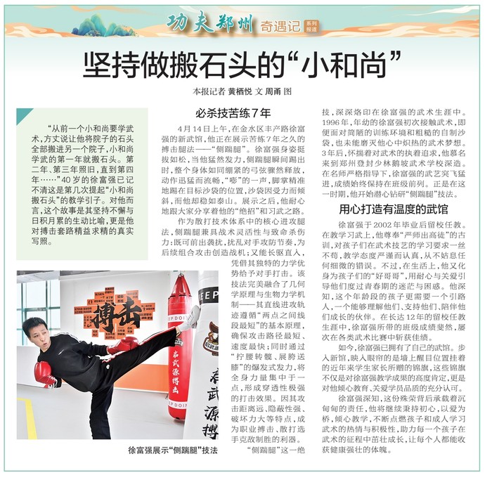 “从前一个小和尚要学武术,方丈说让他将院子的石头全部搬进另一个院子,小和尚学武的第一年就搬石头。第二年、第三年照旧,直到第四年……”40岁的徐富强已记不清这是第几次提起“小和尚搬石头”的教学引子。对他而言,这个故事是其坚持不懈与日积月累的生动比喻,更是他对搏击套路精益求精的真实写照。(今日《郑州日报》8版)