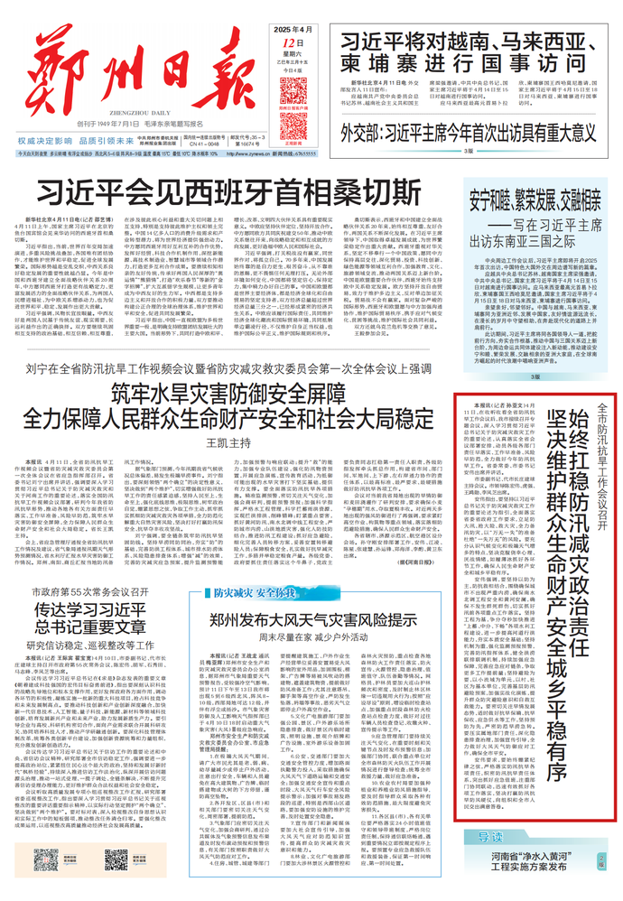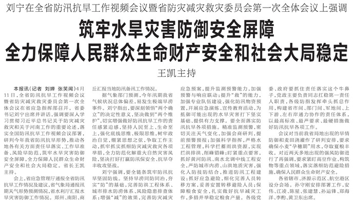 4月11日,全省防汛抗旱工作视频会议暨省防灾减灾救灾委员会第一次全体会议在省应急指挥部召开。省委书记刘宁出席并讲话,强调要深入学习贯彻习近平总书记关于防灾减灾救灾和关于河南工作的重要论述,落实全国防汛抗旱工作视频会议部署,研判今年我省防汛抗旱形势,推动各地各有关方面责任早落实、工作早准备、风险早防范,筑牢水旱灾害防御安全屏障,全力保障人民群众生命财产安全和社会大局稳定。省长王凯主持。(今日《河南日报》1版)