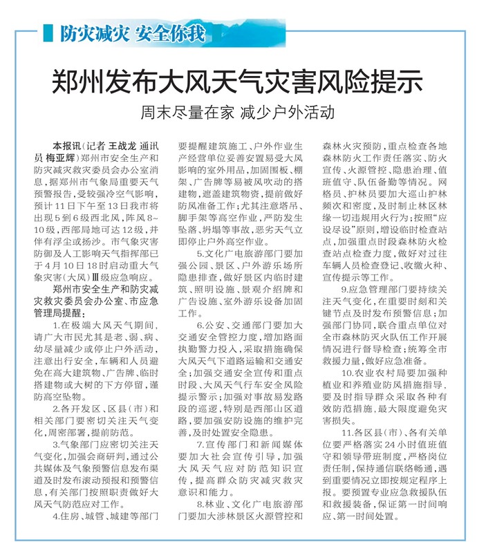 郑州市安全生产和防灾减灾救灾委员会办公室消息,据郑州市气象局重要天气预警报告,受较强冷空气影响,预计11日下午至13日我市将出现5到6级西北风,阵风8~10级,西部局地可达12级,并伴有浮尘或扬沙。市气象灾害防御及人工影响天气指挥部已于4月10日18时启动重大气象灾害(大风)Ⅲ级应急响应。(今日《郑州日报》1版)
