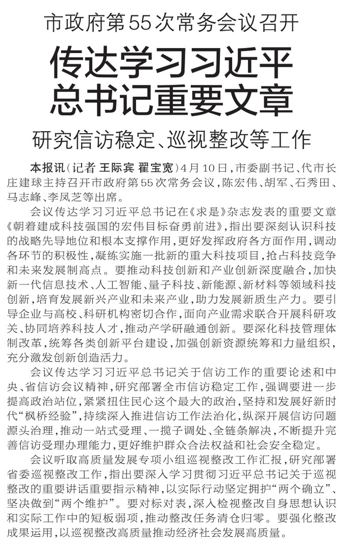4月10日,市委副书记、代市长庄建球主持召开市政府第55次常务会议,陈宏伟、胡军、石秀田、马志峰、李凤芝等出席。(今日《郑州日报》1版)