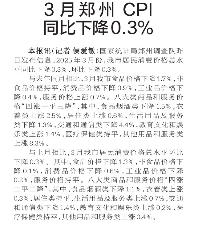 国家统计局郑州调查队昨日发布信息,2025年3月份,我市居民消费价格总水平同比下降0.3%,环比下降0.3%。(今日《郑州日报》2版)