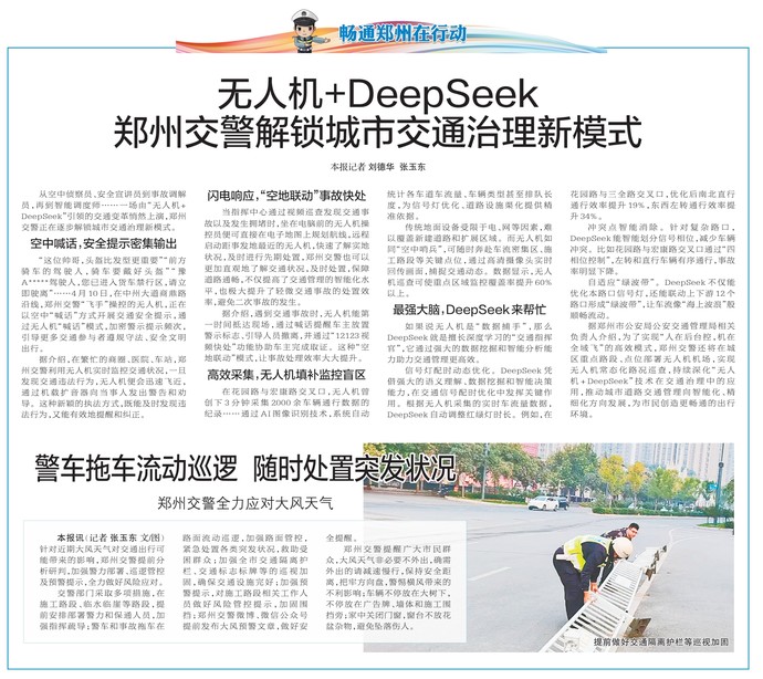 从空中侦察员、安全宣讲员到事故调解员,再到智能调度师……一场由“无人机+DeepSeek”引领的交通变革悄然上演,郑州交警正在逐步解锁城市交通治理新模式。(今日《郑州日报》2版)