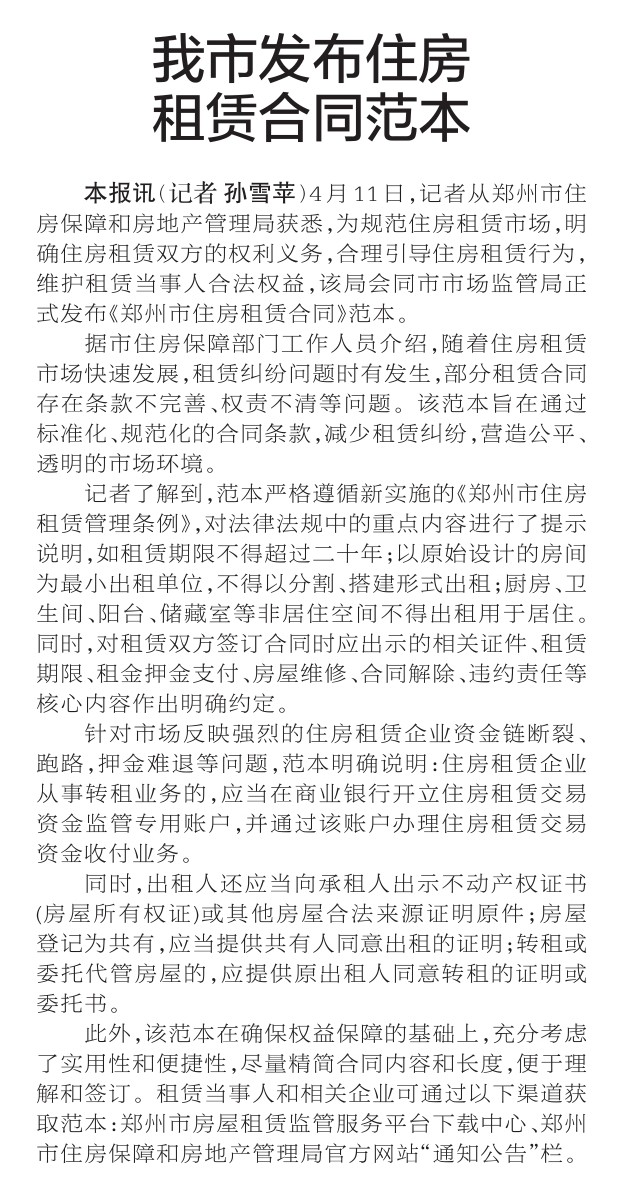 4月11日,记者从郑州市住房保障和房地产管理局获悉,为规范住房租赁市场,明确住房租赁双方的权利义务,合理引导住房租赁行为,维护租赁当事人合法权益,该局会同市市场监管局正式发布《郑州市住房租赁合同》范本。(今日《郑州日报》2版)