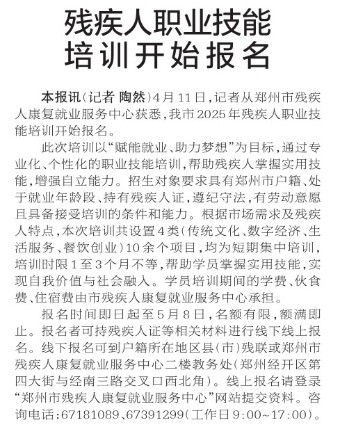 4月11日,记者从郑州市残疾人康复就业服务中心获悉,我市2025年残疾人职业技能培训开始报名。(今日《郑州日报》2版)