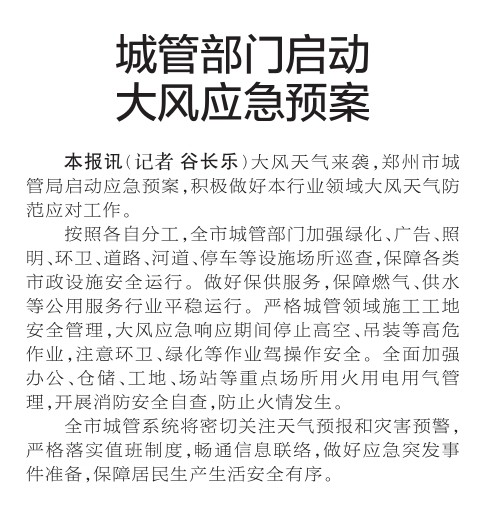 大风天气来袭,郑州市城管局启动应急预案,积极做好本行业领域大风天气防范应对工作。(今日《郑州日报》2版)