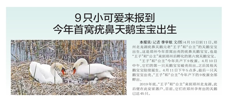 4月10日到11日,郑州北龙湖疣鼻天鹅元老“王子”和“公主”的天鹅宝宝出生,这是郑州今年首窝出壳的疣鼻天鹅宝宝,也是“王子”和“公主”来到郑州后孵化的第六窝天鹅宝宝。(今日《郑州日报》2版)