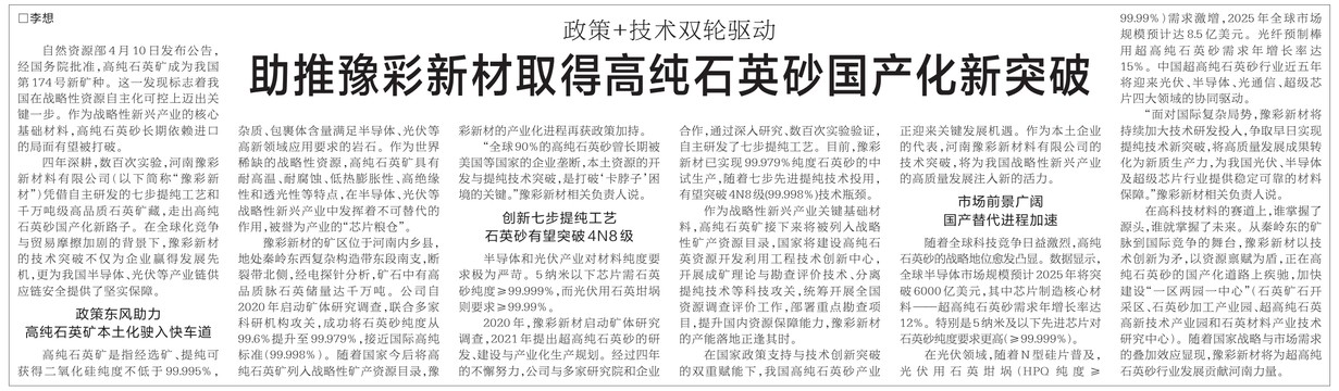 自然资源部4月10日发布公告,经国务院批准,高纯石英矿成为我国第174号新矿种。这一发现标志着我国在战略性资源自主化可控上迈出关键一步。作为战略性新兴产业的核心基础材料,高纯石英砂长期依赖进口的局面有望被打破。(今日《河南日报》1版)