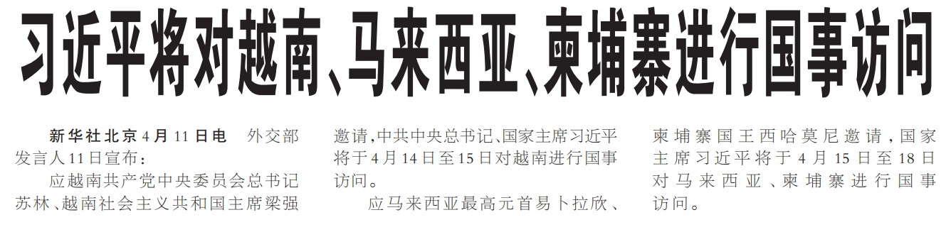 应越共中央总书记苏林、越南国家主席梁强邀请,中共中央总书记、国家主席习近平将于4月14日至15日对越南进行国事访问。应马来西亚最高元首易卜拉欣、柬埔寨国王西哈莫尼邀请,习近平主席将于4月15日至18日对马来西亚、柬埔寨进行国事访问。这是习近平总书记年内首次出访,也是中央周边工作会议召开后首访周边国家。(今日《人民日报》1版、4版)