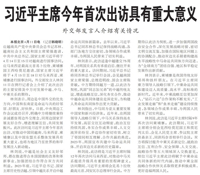 应越南共产党中央委员会总书记苏林、越南社会主义共和国主席梁强邀请,中共中央总书记、国家主席习近平将于4月14日至15日对越南进行国事访问。应马来西亚最高元首易卜拉欣、柬埔寨国王西哈莫尼邀请,国家主席习近平将于4月15日至18日对马来西亚、柬埔寨进行国事访问。外交部发言人林剑11日在例行记者会上介绍了此次出访的主要安排及中方对发展中越、中马、中柬关系的期待。(今日《人民日报》1版)