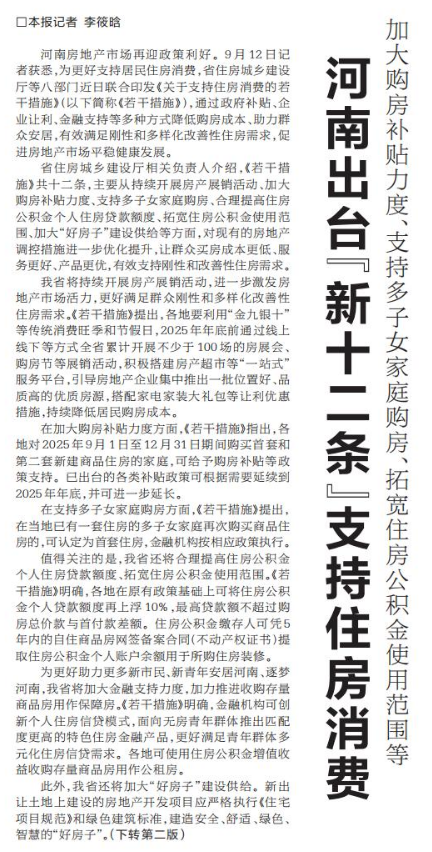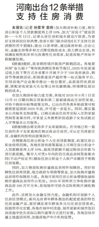 加大购房补贴力度,将住房公积金个人贷款额度再上浮10%,加大“好房子”建设供给……9月12日,记者从省住房和城乡建设厅获悉,为更好支持居民住房消费,我省8部门联合印发《关于支持住房消费的若干措施》,提出12条举措,通过政府补贴、企业让利、金融支持等多种方式降低购房成本、助力群众安居,有效满足刚性和多样化改善性住房需求,促进房地产市场平稳健康发展。(今日《郑州日报》1版)